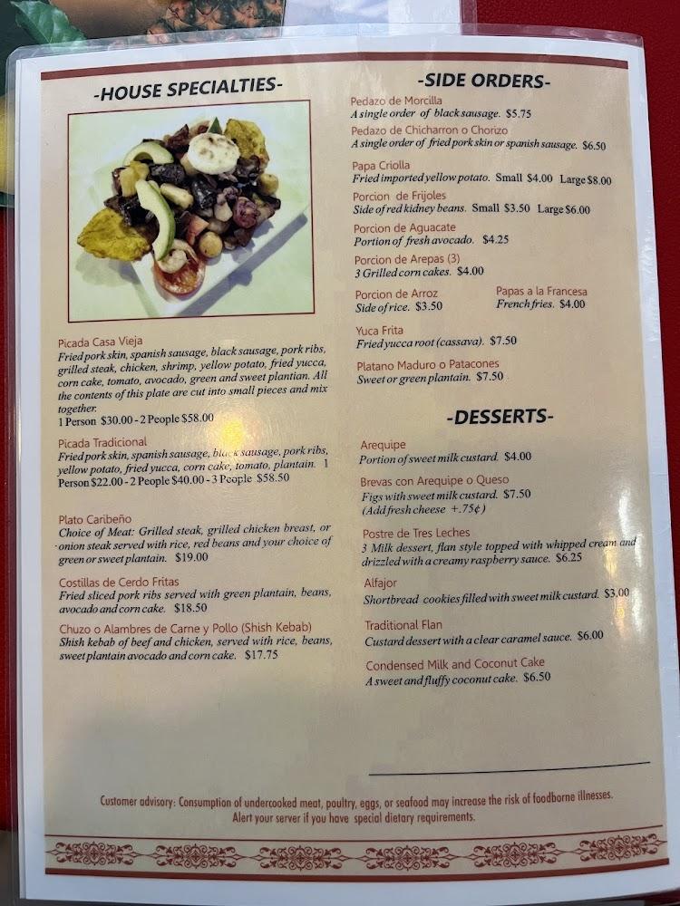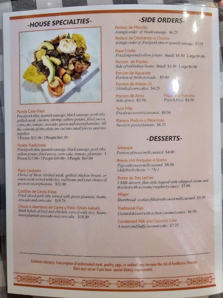 Specialties include the mini Bandeja Paisa and Patacones, which are popular among guests. The appetizer section, filled with items like Morcilla and Chorizo, invites exploration. Desserts like homemade Flan wrap up meals perfectly. Overall, the menu ensures there's something for everyone.